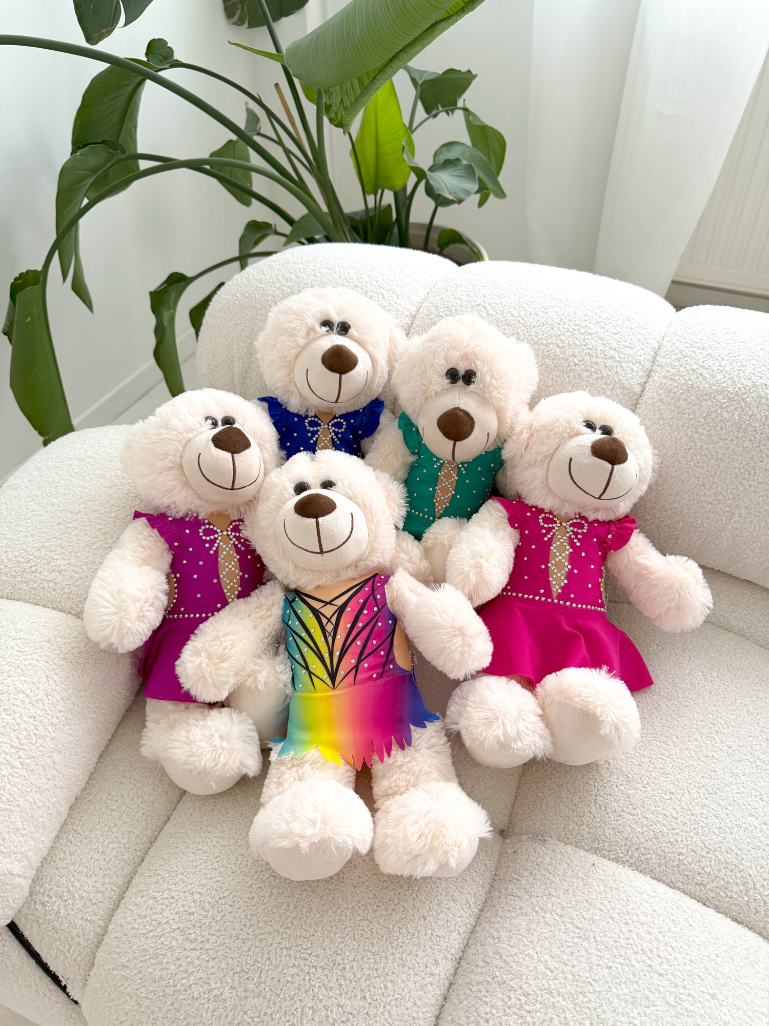 Pluszowe misie w prawdziwych strojach startowych do gimnastyki, ozdobione kamieniami. Idealne na prezent dla gimnastyczki.