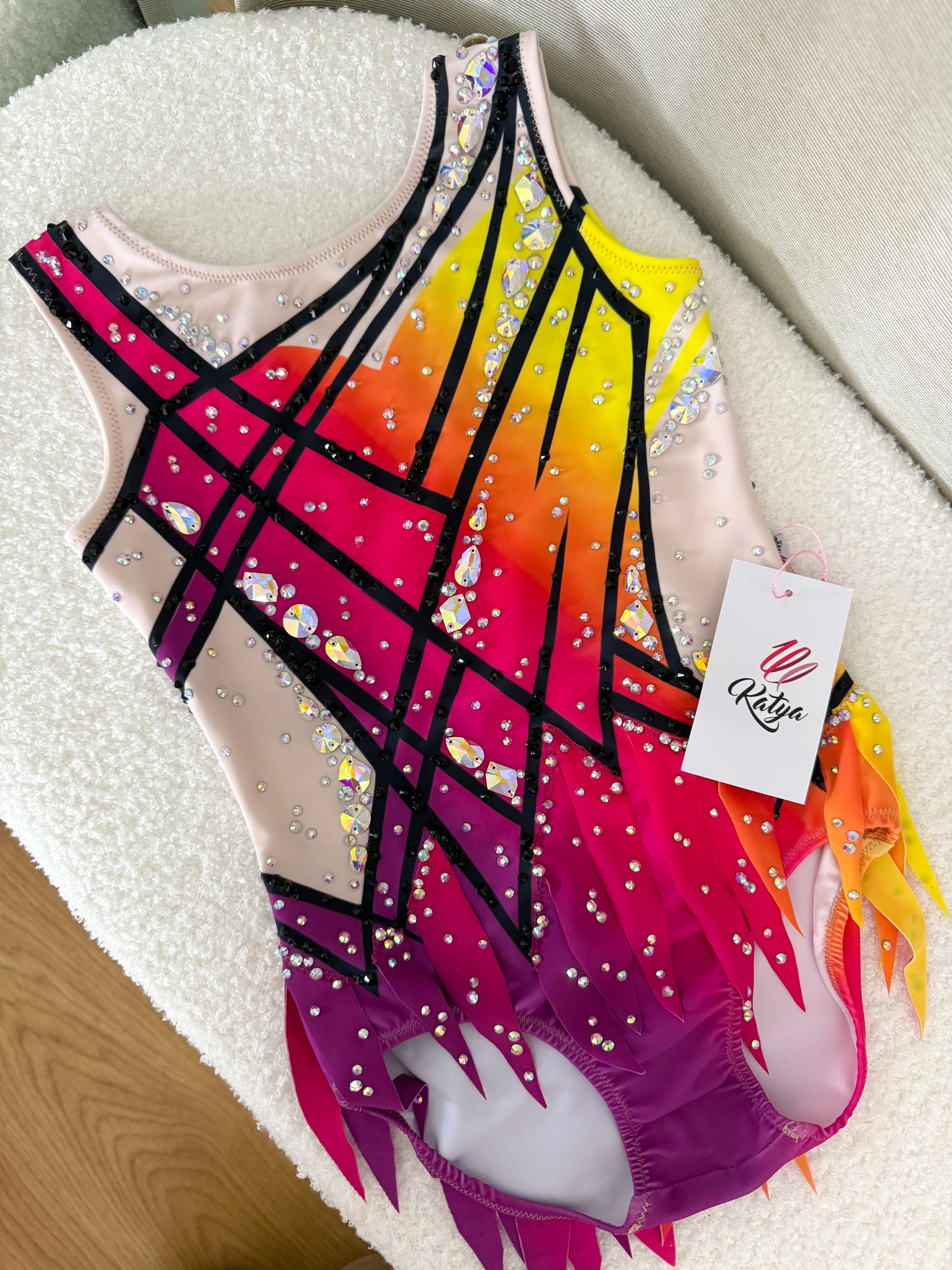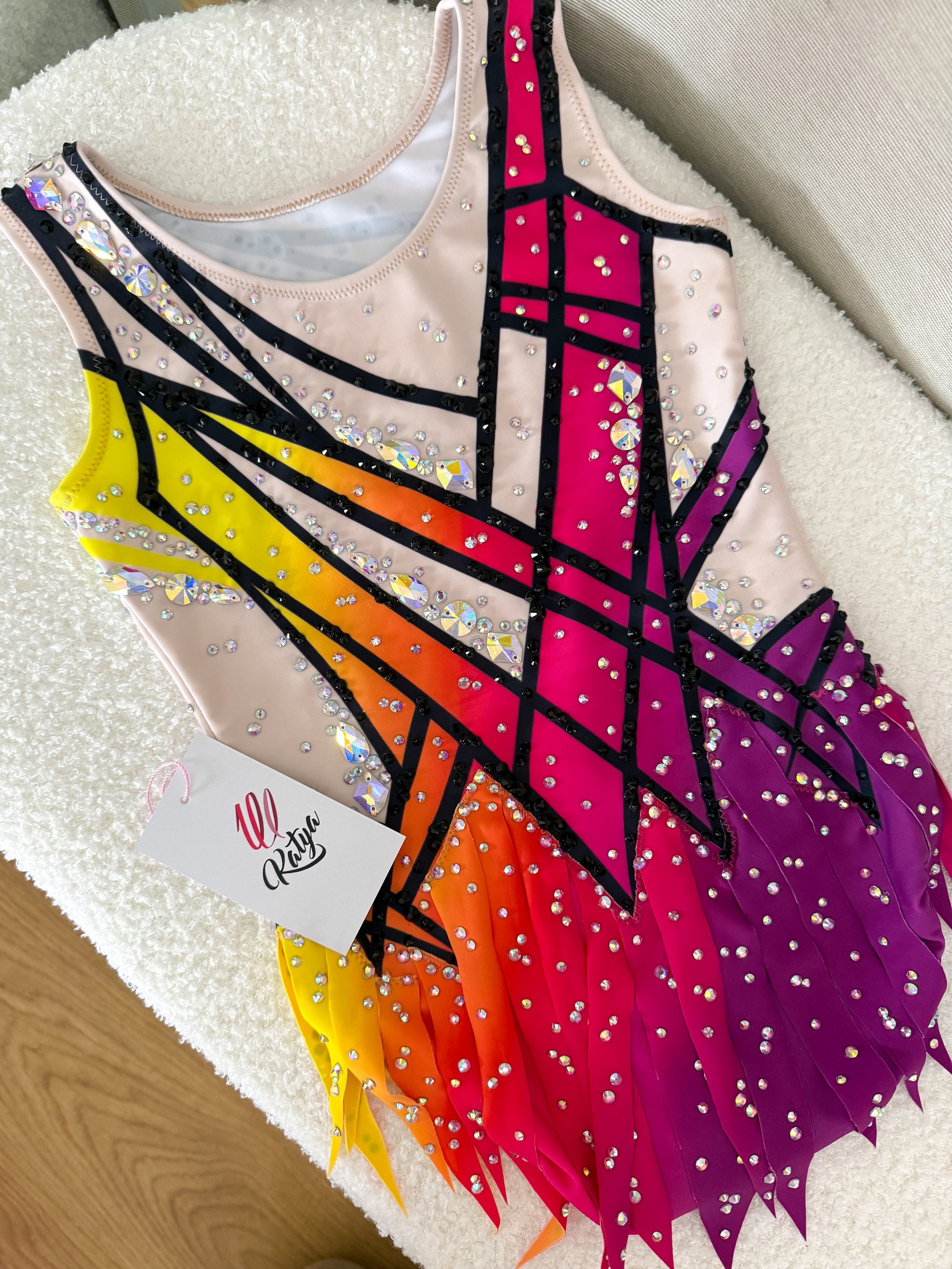 Rozmiar około 116-122. Strój został wykonany w całości z wysokiej jakości lycry o wysokim stopniu elastyczności - strój drukowany. Strój posiada efektowną spódniczkę. Ozdobiony kamieniami Crystal AB w różnych rozmiarach i kamieniami przyszywanymi Crystal AB w różnych rozmiarach i kształtach.