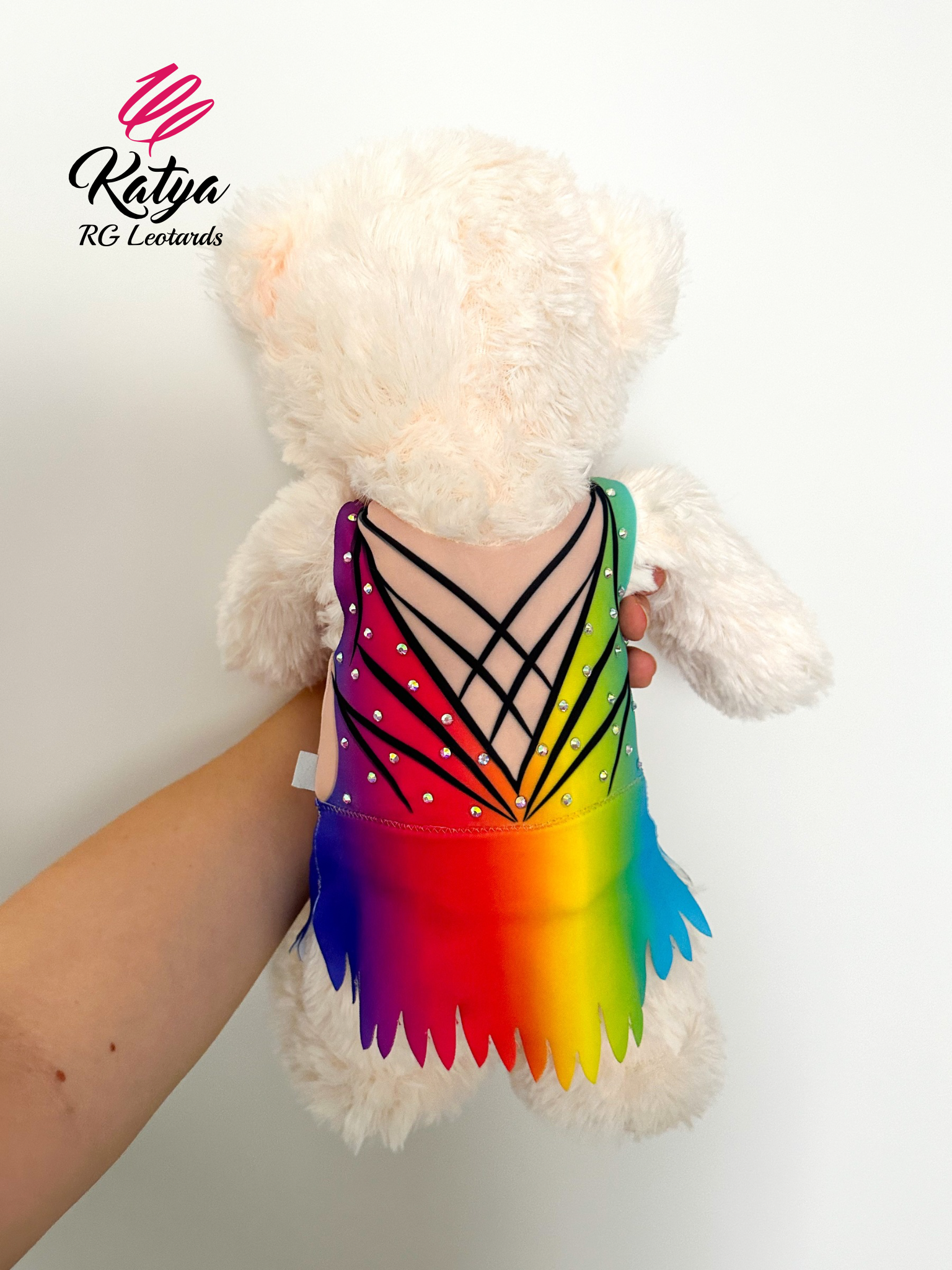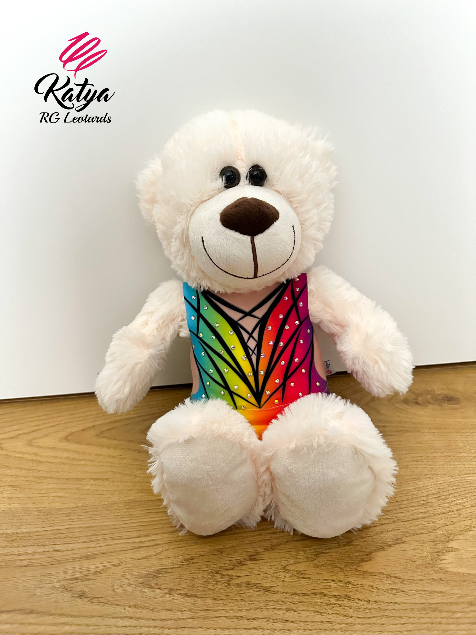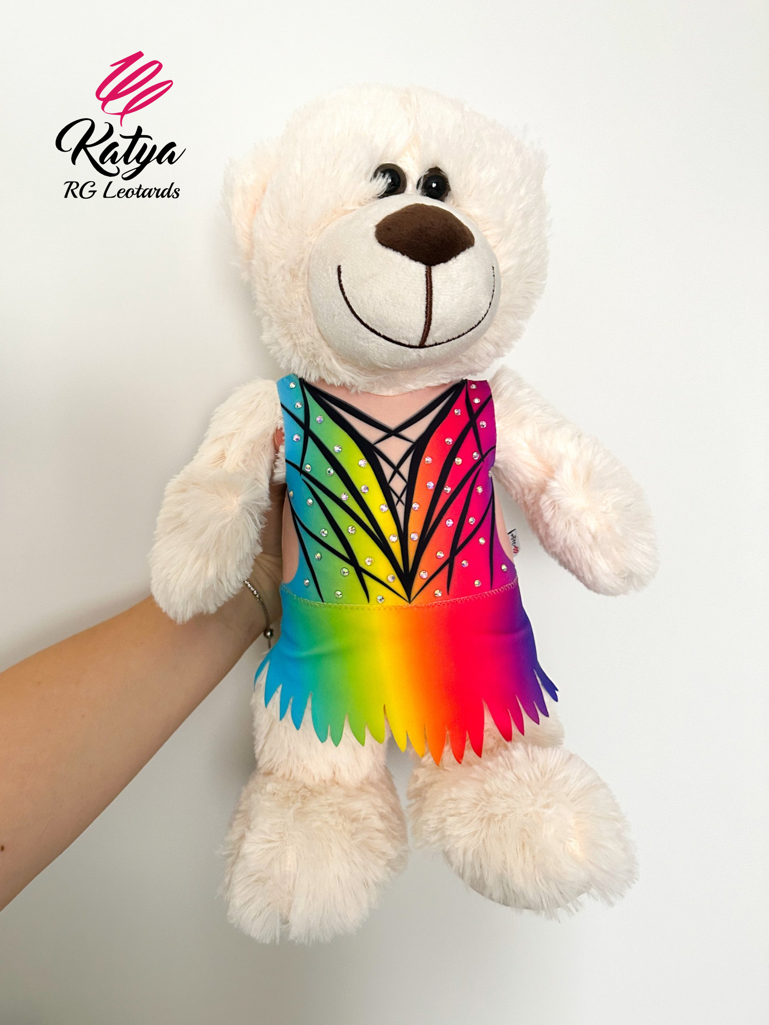 Piękny pluszowy miś - gimnastyczka w kolorze białym ubrany w prawdziwy strój startowy. Każda mała gimnastyczka go pokocha. Idealny prezent dla dziewczynki na urodziny, święta, za wygranie zawodów lub na otarcie łez. Na stroju znajdują się kamienie Crystal AB - takie same jakich używamy na prawdziwych strojach. Strój posiada spódniczkę.